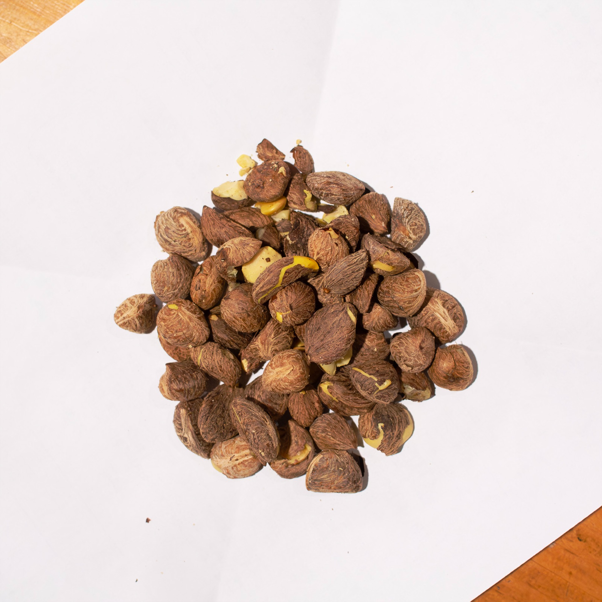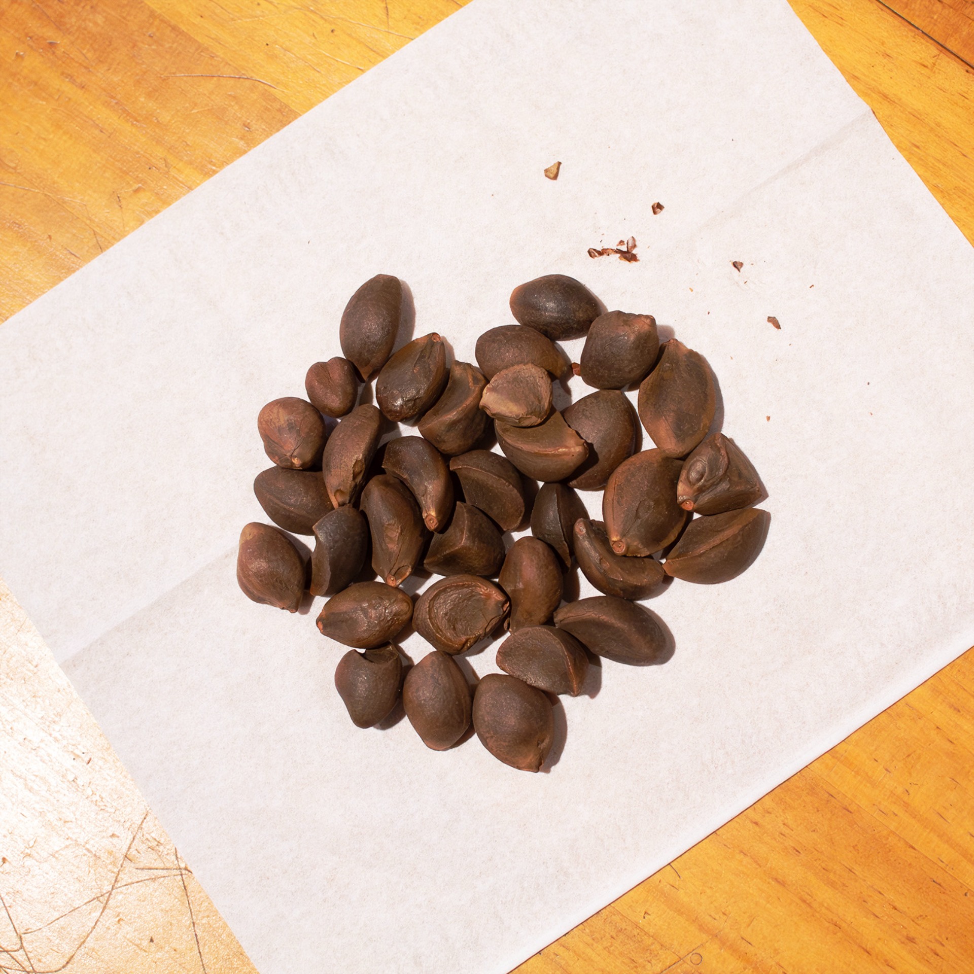 2025/11/05 こんにちは。立冬前、薄雲が広がる穏やかな晴れの日。とても良いですが、今日は外仕事はひと休憩としました。代わりに蓄えを用意しています。椿の種です。この辺りでは、秋期に柿、大根、白菜、キャベツなど、秋冬越しの食料の蓄えの準備に取り掛かっています。同じ時期、花畑では次の一年のための花枝葉の乾物、甘味、油、脂の準備をしています。バラ栽培の重要な時期ですので、その合間をぬって、最低量をちょっとずつしています。ともかくも、季節ものはキチンと旬の時季に手当することは、栄養成分表なんかにあるような成分の最大化と新鮮化に繋がってますよね。そして時季を繰り返して迎えていれば、結果、よい習慣・慣例に繋がりますね。ということで、今日は油です。今年の椿種はたったこれだけ。花数は格別に多かったのですが、開花時期の遅延と結実の悪さで実りは少ない年でした。殻を割って中身を炒ったところです。香良し、胚乳感良しです。^^搾油生絞り状態です。油脂混在していますが、このまま静置します。しばらくすれば綺麗に分離して、透明感のある油を取り出せます。55gの胚(乳)から15ml程度取れました。去年の3割くらいですが、それでよいのです。今年も採れたということがまず大切。テコがあるものの手力ですので、絞り出せない油粕が多めに残ります。文字通りですが、この粕は発酵油粕にして庭・畑に戻します。^^